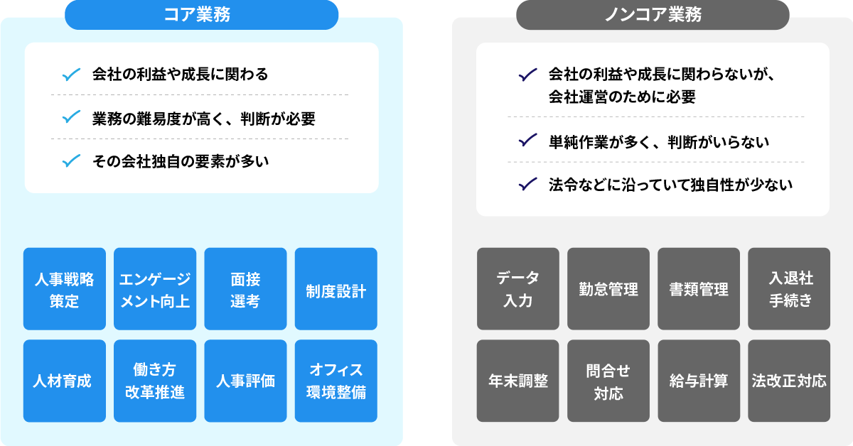 ところが、多くの企業ではその「人」が有効に活かされていないのが現状です。それは各企業の利益に直結する本業「=コア業務」以外の業務に多くの労力が割かれているからです。そのコア業務ではない業務「=ノンコア業務」の代表的なものが給与計算です。