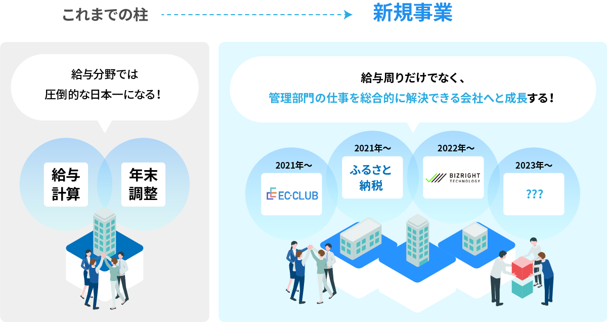 これまでの事業の柱であった給与関連BPO業務に加え、給与明細サービスを主とした顧客企業の従業員向けサイト「EC-CLUB」の開発、地方自治体の事務BPO「ふるさと納税事務アウトソーシング」など、他の分野へ当社が持つノウハウを応用し、今後はすべての管理部門のBPOソリューションを提供する会社へと発展していきます。