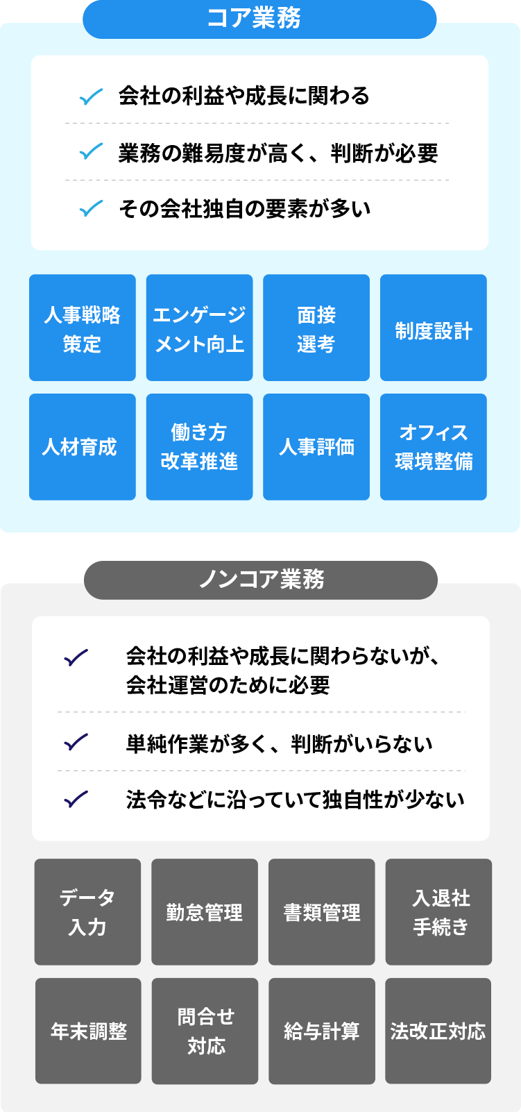 ところが、多くの企業ではその「人」が有効に活かされていないのが現状です。それは各企業の利益に直結する本業「=コア業務」以外の業務に多くの労力が割かれているからです。そのコア業務ではない業務「=ノンコア業務」の代表的なものが給与計算です。