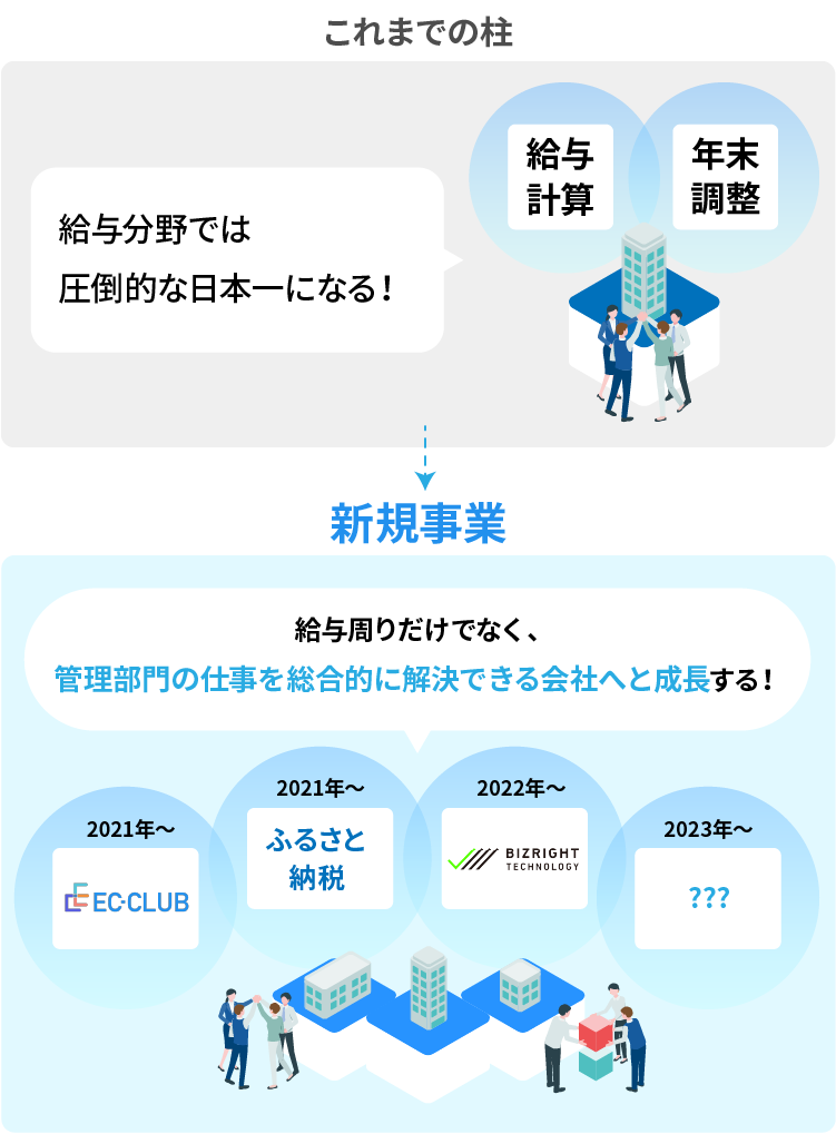これまでの事業の柱であった給与関連BPO業務に加え、給与明細サービスを主とした顧客企業の従業員向けサイト「EC-CLUB」の開発、地方自治体の事務BPO「ふるさと納税事務アウトソーシング」など、他の分野へ当社が持つノウハウを応用し、今後はすべての管理部門のBPOソリューションを提供する会社へと発展していきます。