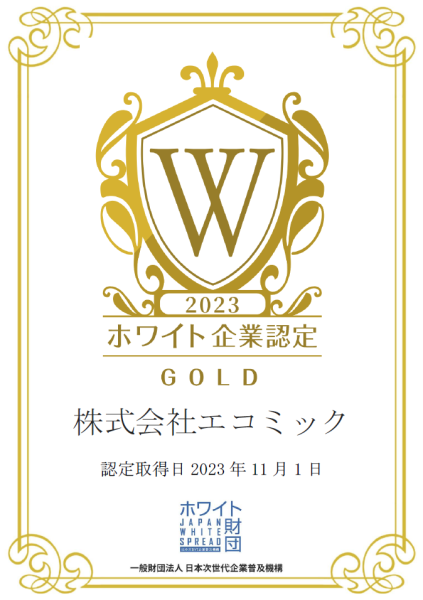 この度、株式会社エコミックは「ホワイト企業認定(ゴールドランク)」に認定されました。